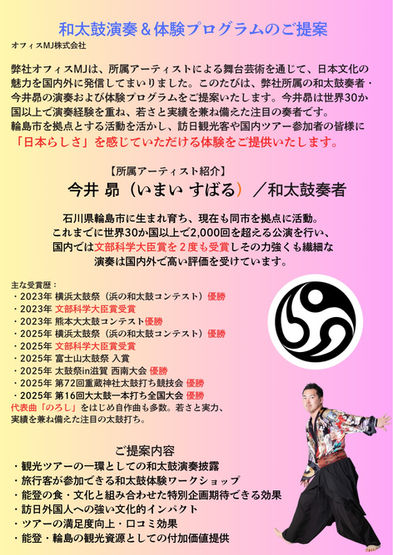 観客との交流や参加型の演出を取り入れ、会場全体を一体感で包み込みます。 世界30ヵ国・2000公演以上の実績を誇り、 さらに文部科学大臣賞を2023年・2025年の2度受賞した“国家が認めた太鼓打ち”今井昴。